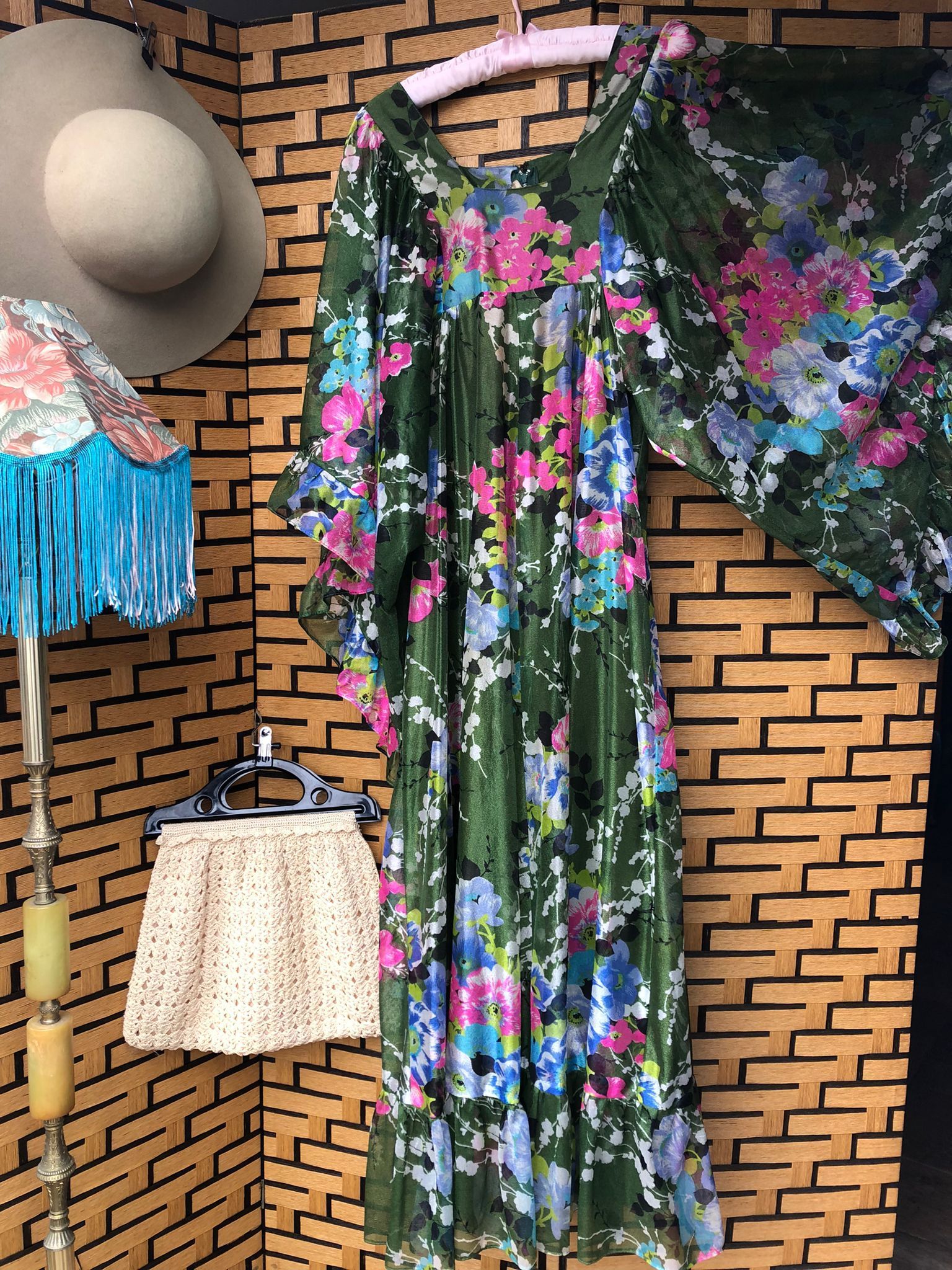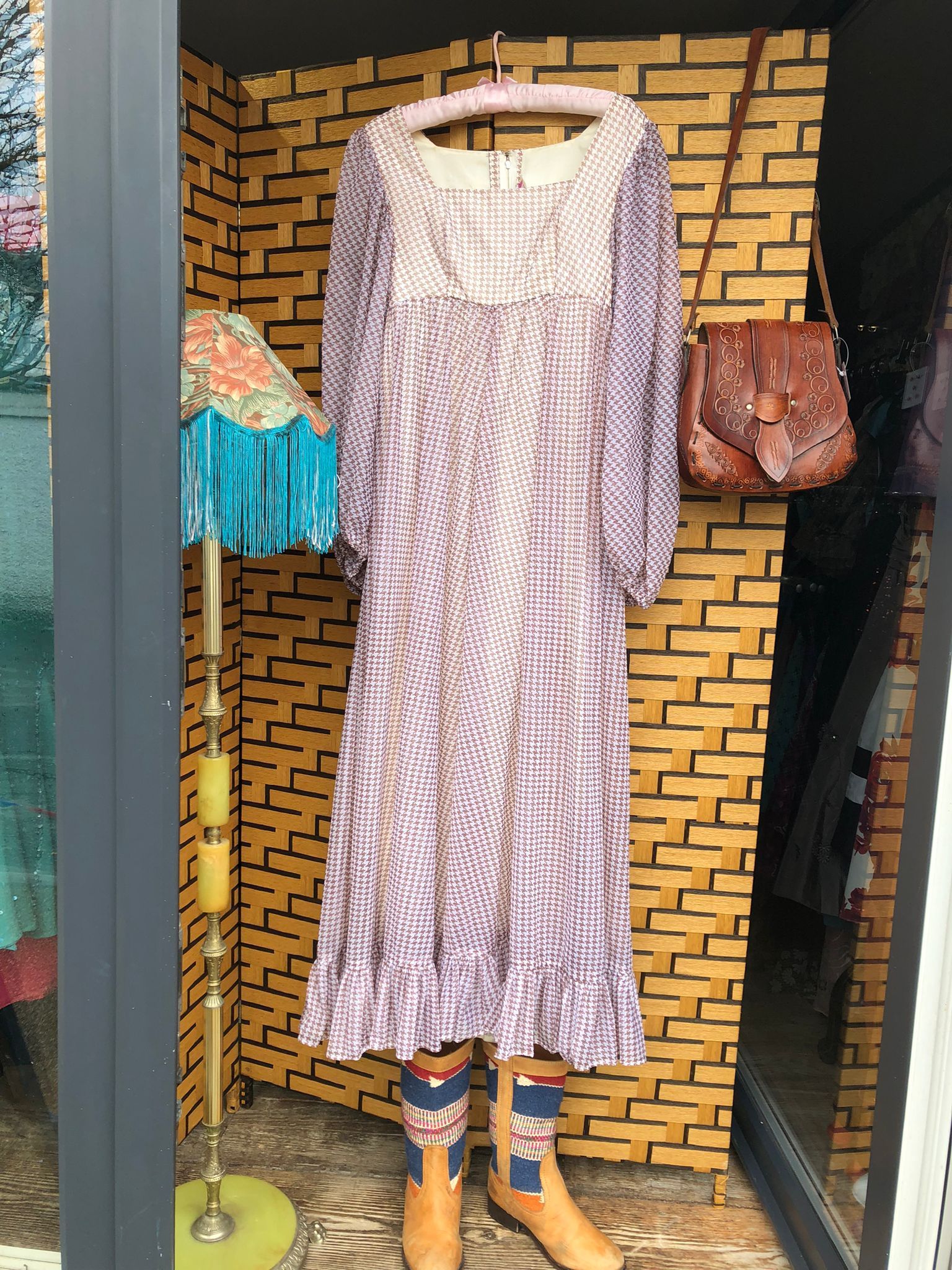 Beautiful pink 1960/70s Houndstooth print balloon sleeve long festival flowing dress